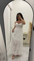 Un abito lungo in sangallo bianco dal fascino senza tempo. Il bustino con coppe strutturate valorizza la silhouette, mentre le spalline sottili regolabili da annodare sulle spalle donano un tocco romantico e raffinato. Il tessuto traforato, leggero e arioso, lo rende ideale per le giornate estive e perfetto da indossare sia di giorno che di sera.